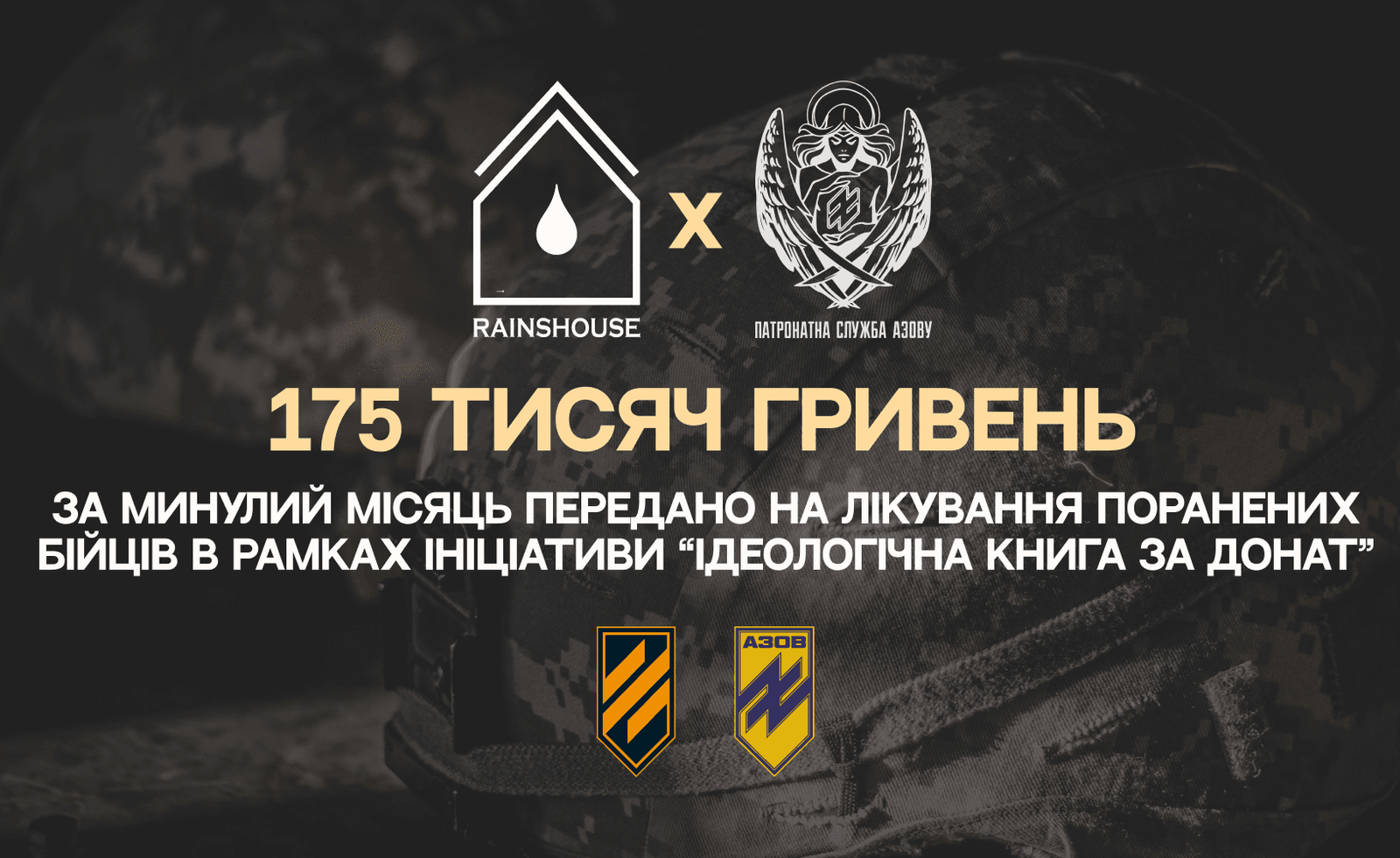 175 тисяч гривень за минулий місяць передано видавництвом RAINSHOUSE на лікування поранених бійців 12 бригади спеціального призначення НГУ АЗОВ та 3-ої окремої штурмової бригади. Кошти вже на рахунку Патронатної служби. Це лише перший переказ. Ініціатива щодо отримання ідеологічних книг від військових за донат діє безстроково, тож до неї можна долучитись будь-коли. Аби взяти участь, необхідно зробити […]